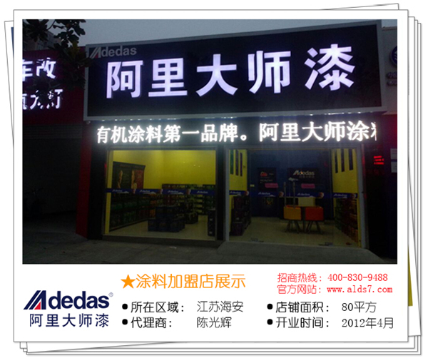 2012年4月我通過網(wǎng)絡(luò)了解到阿里大師,2天后阿里大師的區(qū)域經(jīng)理到我店里與我談合作,他們的開店模式和油工會議模式是我之前油漆品牌所沒有的。合作到2012年底只用了7個月的時間讓阿里大師一下成為海安家喻戶曉的油漆品牌,之前的店面較小,較偏2014年初公司支持我我將店面擴(kuò)大到如今的形象,同時在公司區(qū)域經(jīng)理的協(xié)助下開了場近150人的油工會,目前阿里大師在海安乃至周邊地區(qū)都是家喻戶曉的。